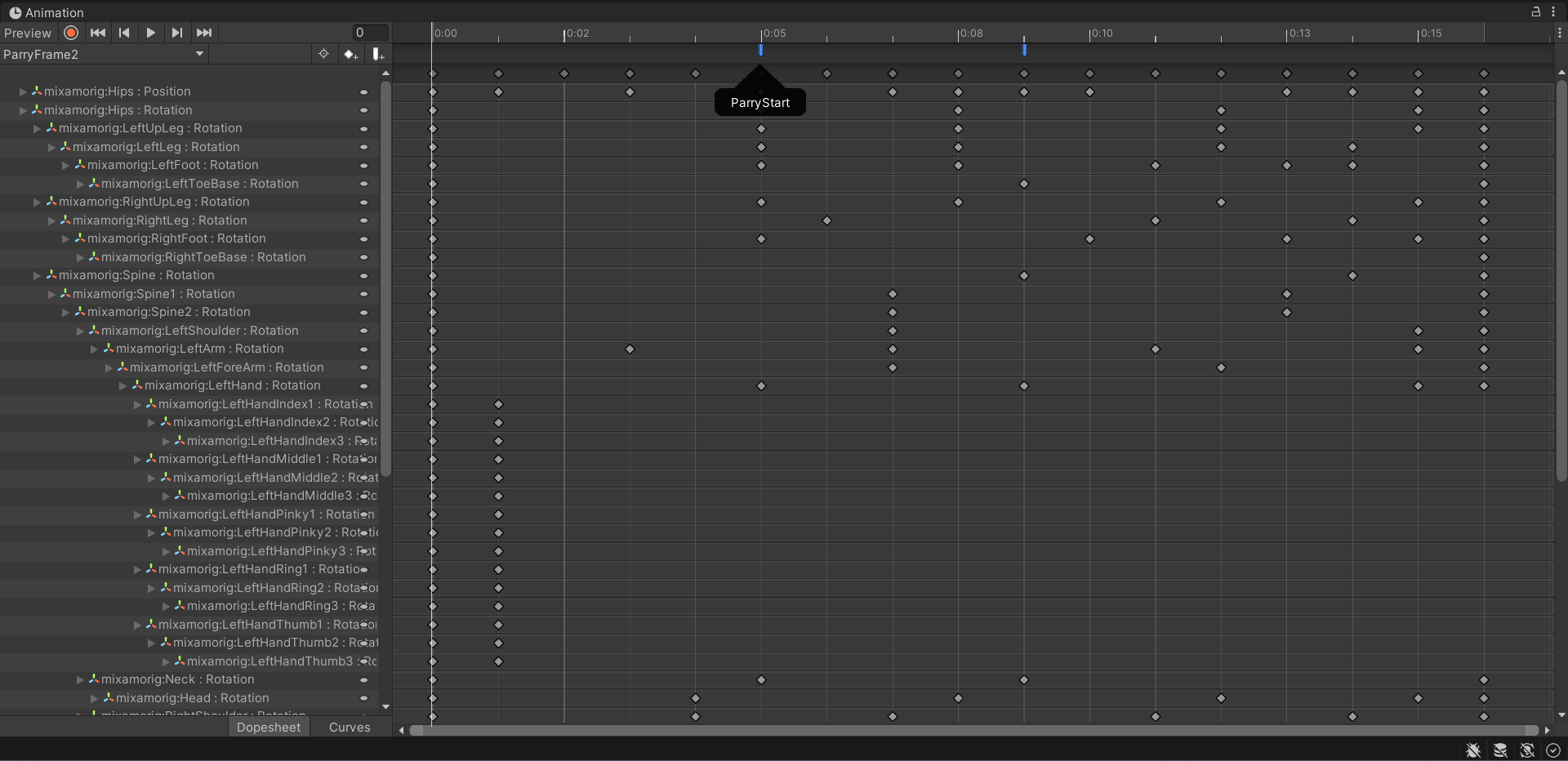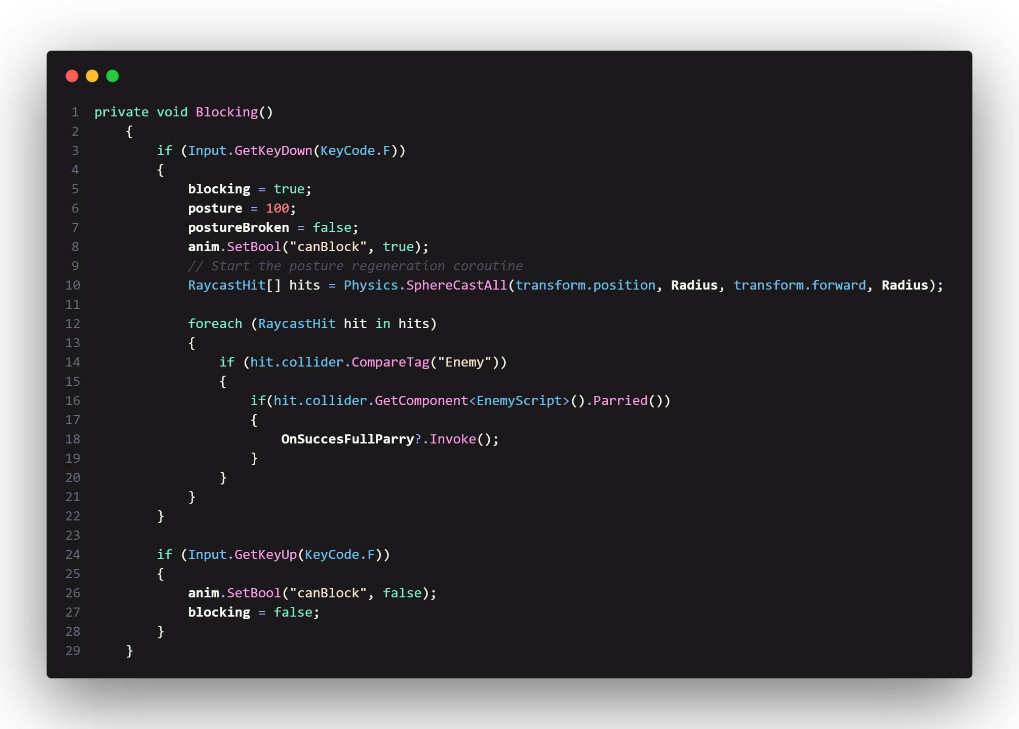 After i checked the mechanic I wanted the code to remain efficient yet simple, so I could implement it easily into the animation sequence. On GetKeyDown F I cast a sphereCastAll that checks the position of the objects inside of its radius, then for each RayCast it hits, it checks if the collider has the Tag enemy. If the object has the tag enemy and then enemy script gives the signal it can be parried, then the parry will be invoked through the animation.