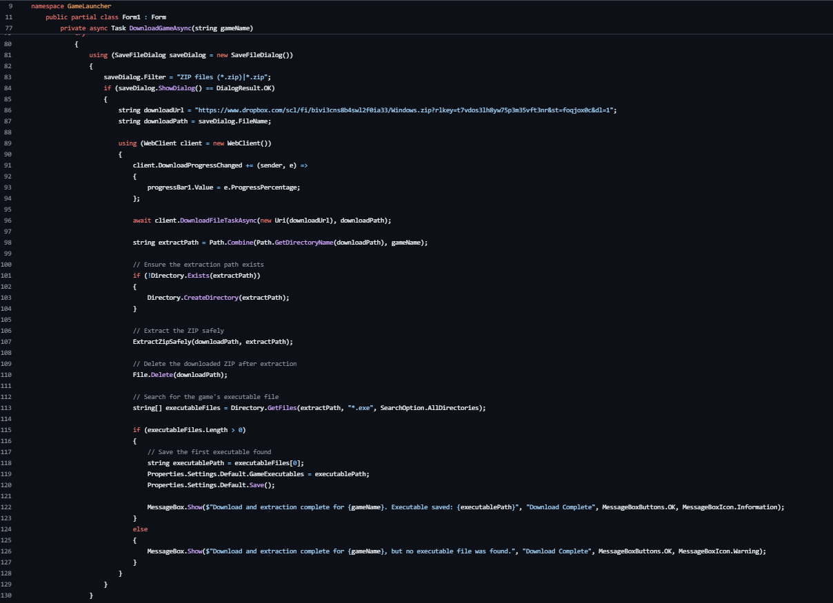 I saw on a forum that its easiest to store a zipped build on a cloud storage where you have easy access too. I tried putting it on google but because of the 50MB verification on there I couldnt download the file without verifying, so I looked around for other cloud storages and found dropbox. Dropbox allowed me to store the zipped build and create a download link. I then wrote a code that extracts the zip after downloading the file. It then automatically saves the downloaded location and when you press launch it grabs the .exe file from the saved dir for the launch of the project.