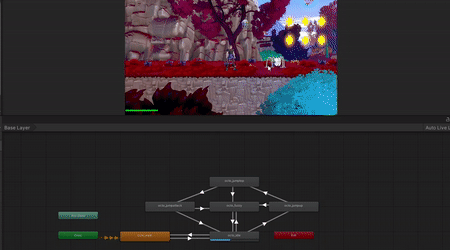 Patrol and detection systems already existed in the codebase for flying enemies. Together with the other dev, I refactored and extended this logic to support Octo as the first ground-based enemy. Through pair programming, we adapted pathfinding and detection behavior, so it could handle grounded patrol routes reliably. The Animator triggers with the enemy's state machine, making sure Octo’s Idle, Walk, Jump, Attack, and Fuzzy states transitioned smoothly. Unity Events were used to time animation transitions such as JumpUp → JumpTop → JumpAttack.